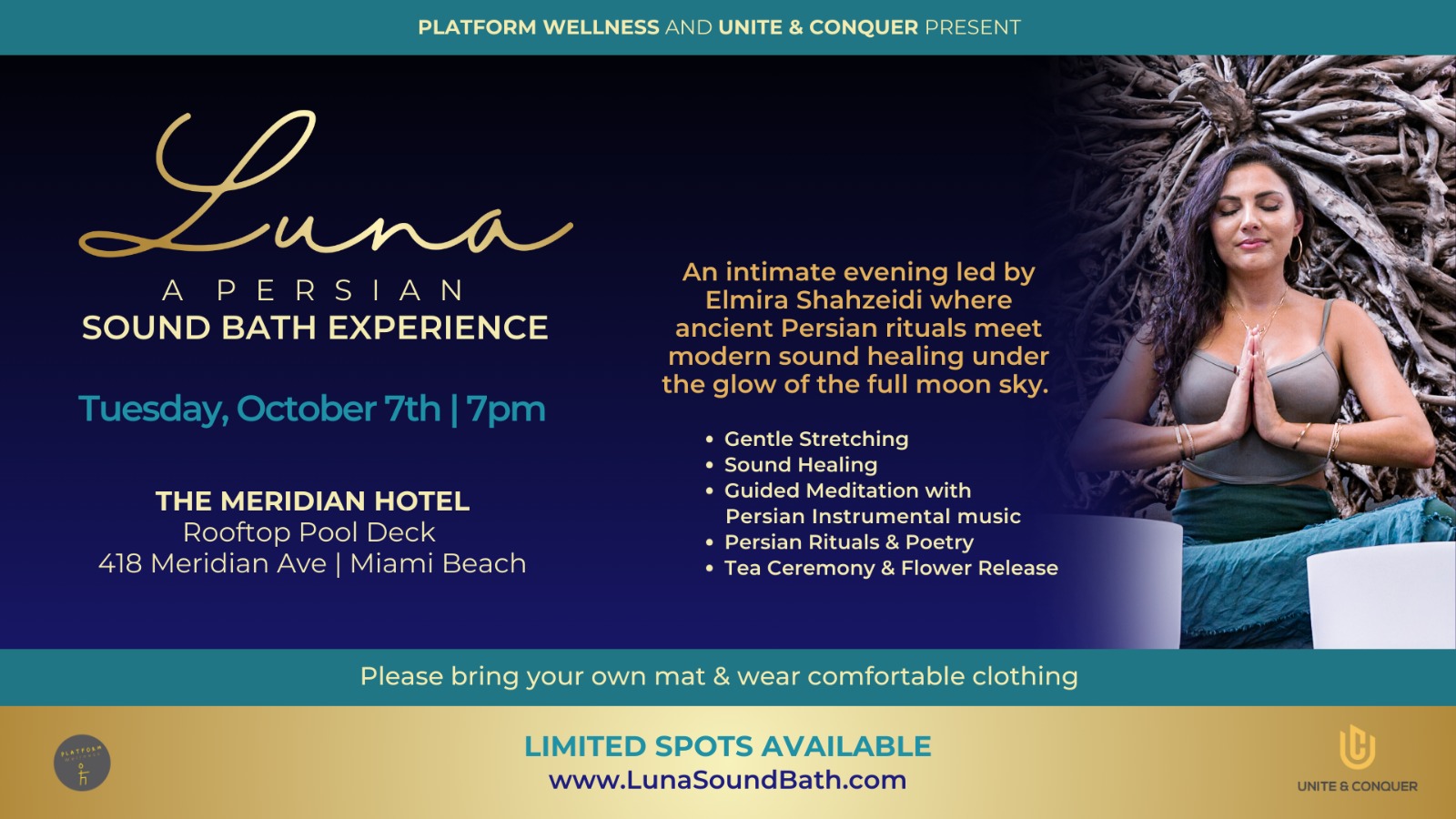 The evening of Tuesday, October 7th, on the rooftop pool deck of The Meridian Hotel was, without a doubt, an unforgettable soiree. Under the mystical glow of the full moon, Elmira Shahzeidi’s LUNA – A Persian Sound Bath experience unfolded as an authentic cultural and sensory journey.